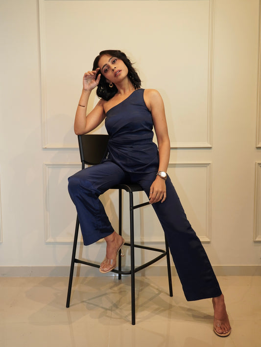 This cord set showcases a sleek one-shoulder design with intricate side knot detailing and beaded tassels. The crepe fabric drapes beautifully, while the straight pants with pockets ensure a perfect balance of elegance and practicality.